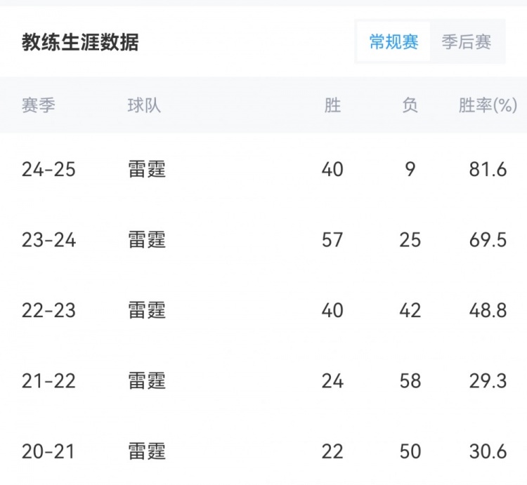 相信過程!雷霆主帥每季執(zhí)教勝率:頭兩季30%→49%→70%→82%
