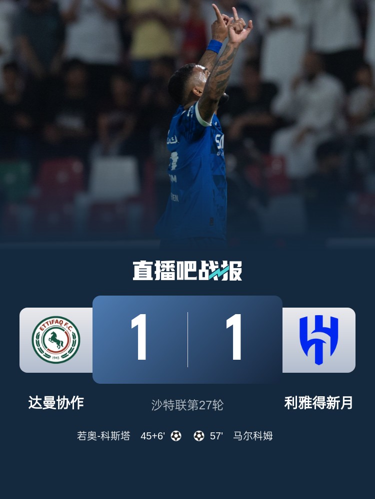 沙特聯(lián)第27輪,利雅得新月1-1達曼協(xié)作。上半場,若奧-科斯塔再補時最后時刻世界波破門;下半場,洛迪助攻馬爾科姆破門扳平比分。