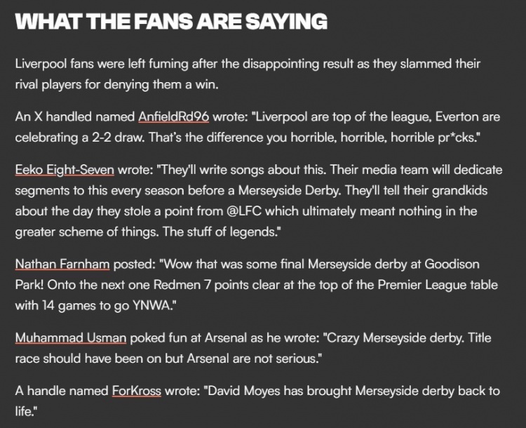 2月13日訊 英超第15輪補(bǔ)賽,利物浦客場(chǎng)2-2遭埃弗頓絕平,比賽爭(zhēng)議場(chǎng)面不斷,賽后雙方還爆發(fā)了沖突。國(guó)外一些紅軍球迷對(duì)這場(chǎng)比賽表達(dá)了看法。