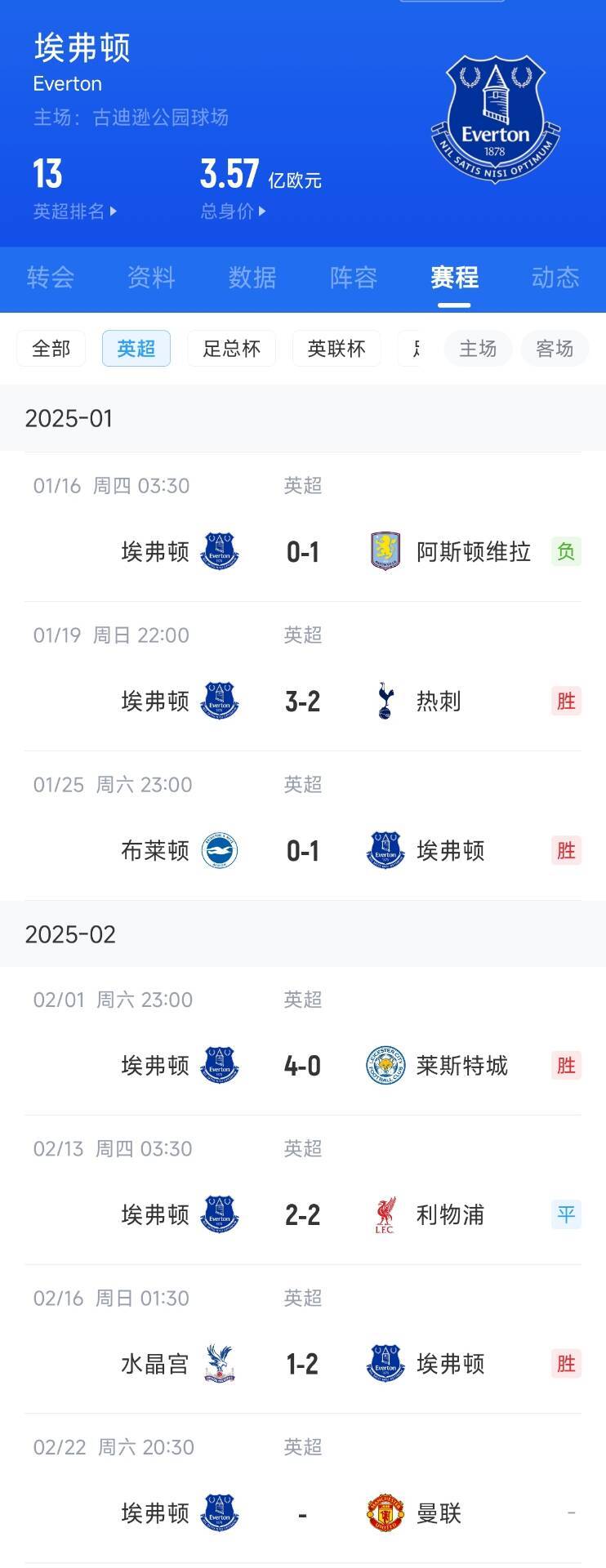 02月16日訊 英超第25輪,埃弗頓2-1客勝水晶宮,近5輪4勝1平狂攬13分。莫耶斯上任之后6場英超比賽,只在首秀0-1輸了維拉。
